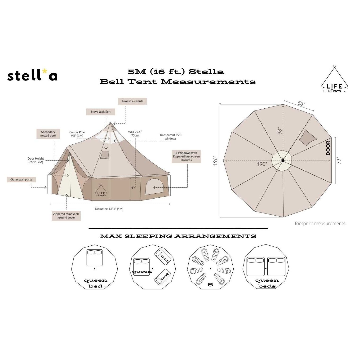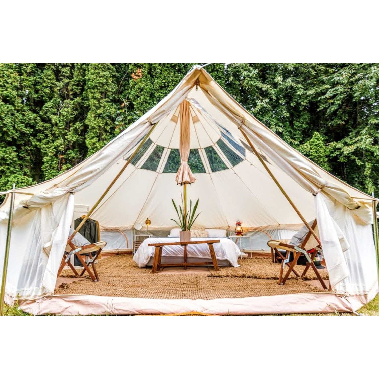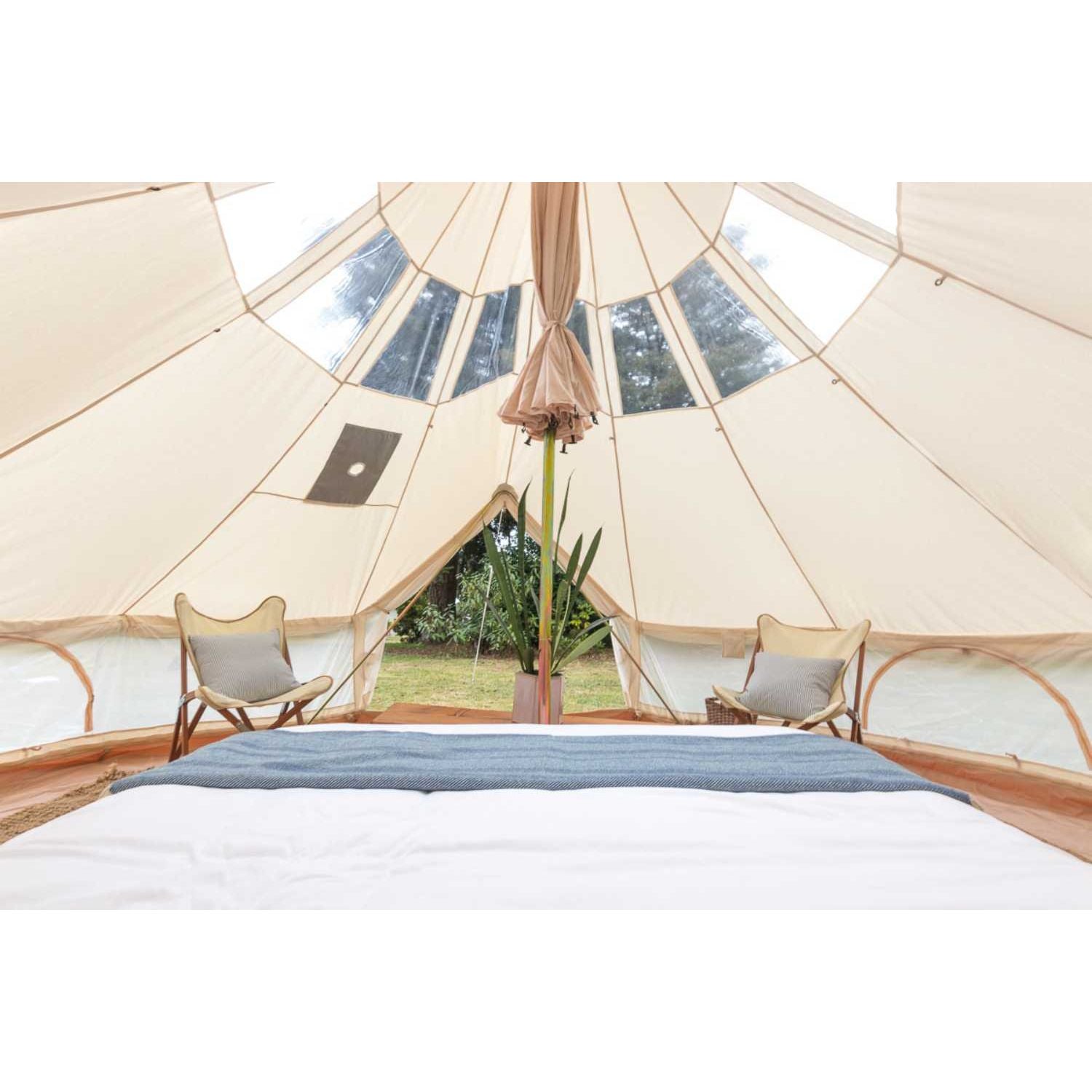 We’ve designed the 16-foot LiT Stella canvas bell tent to be both a beauty and a beast. Use the Stella bell tent for stargazing, birdwatching, cloud spotting and a magical guest room. This skyview glamping tent comes with all the features of our Fernweh bell tent, with the added feature of a 360 degree transparent clear top tent roof panels.