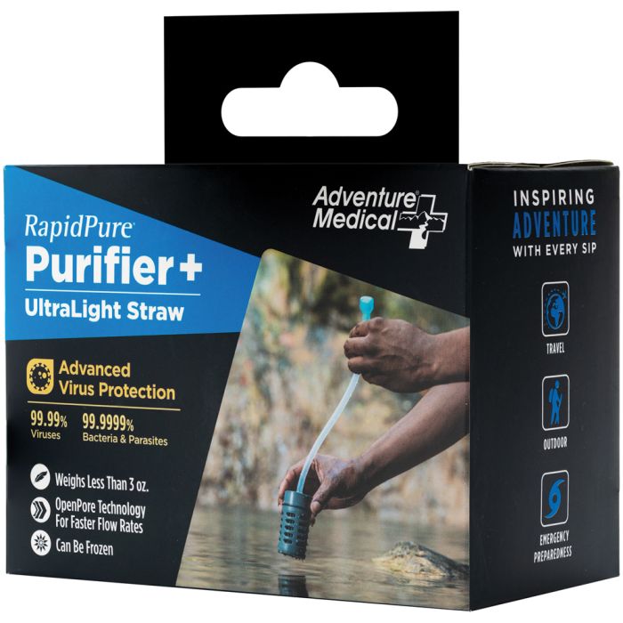The Purification Straw is a lightweight and critical piece for essentials planning. It contains a mouthpiece to prevent cross-contamination and the filter lifespan is 50 gallons. It filters out viruses, bacteria, and parasites. It works in freezing temperatures and is sized to fit within a standard wide mouth water bottle.