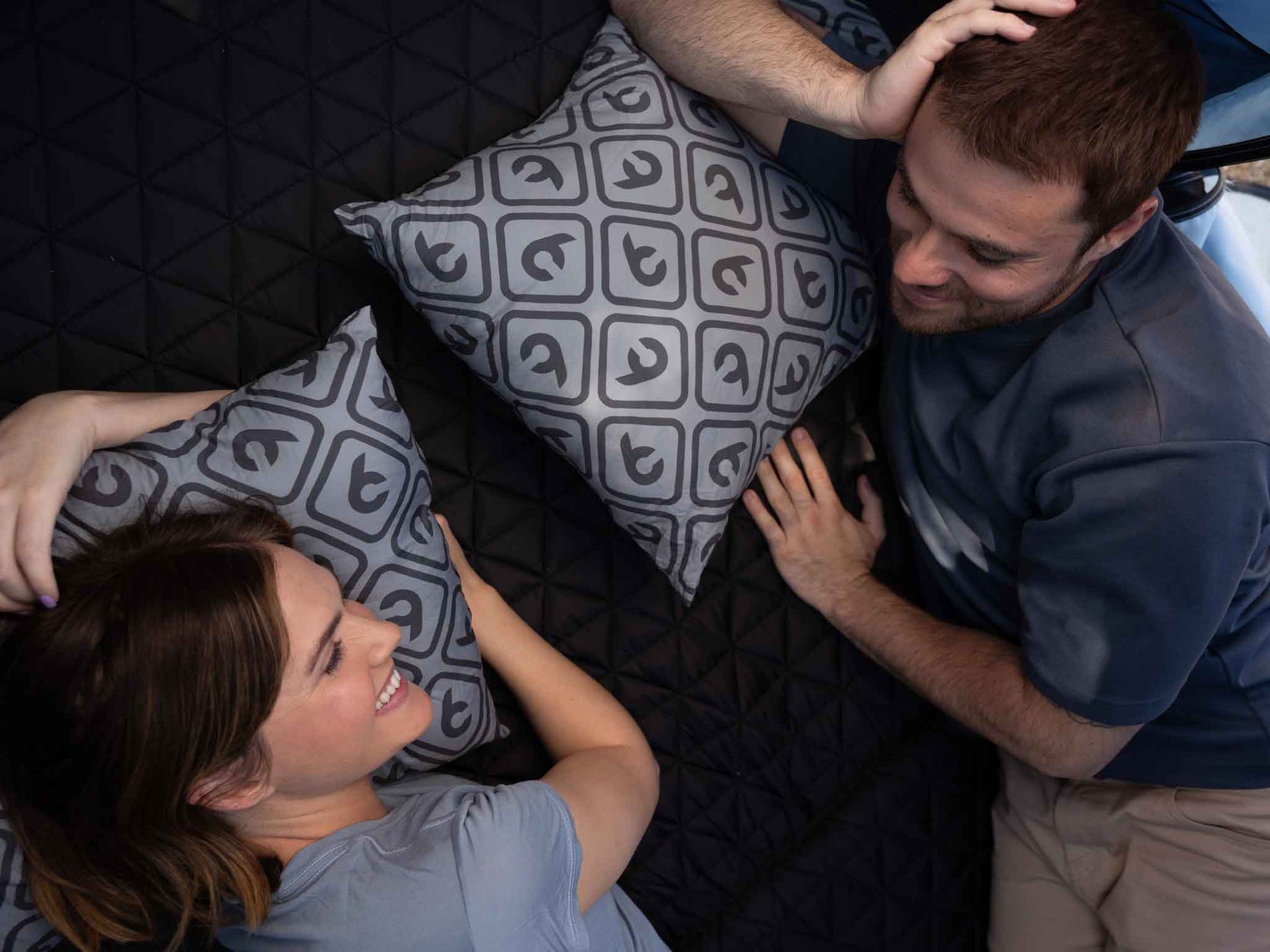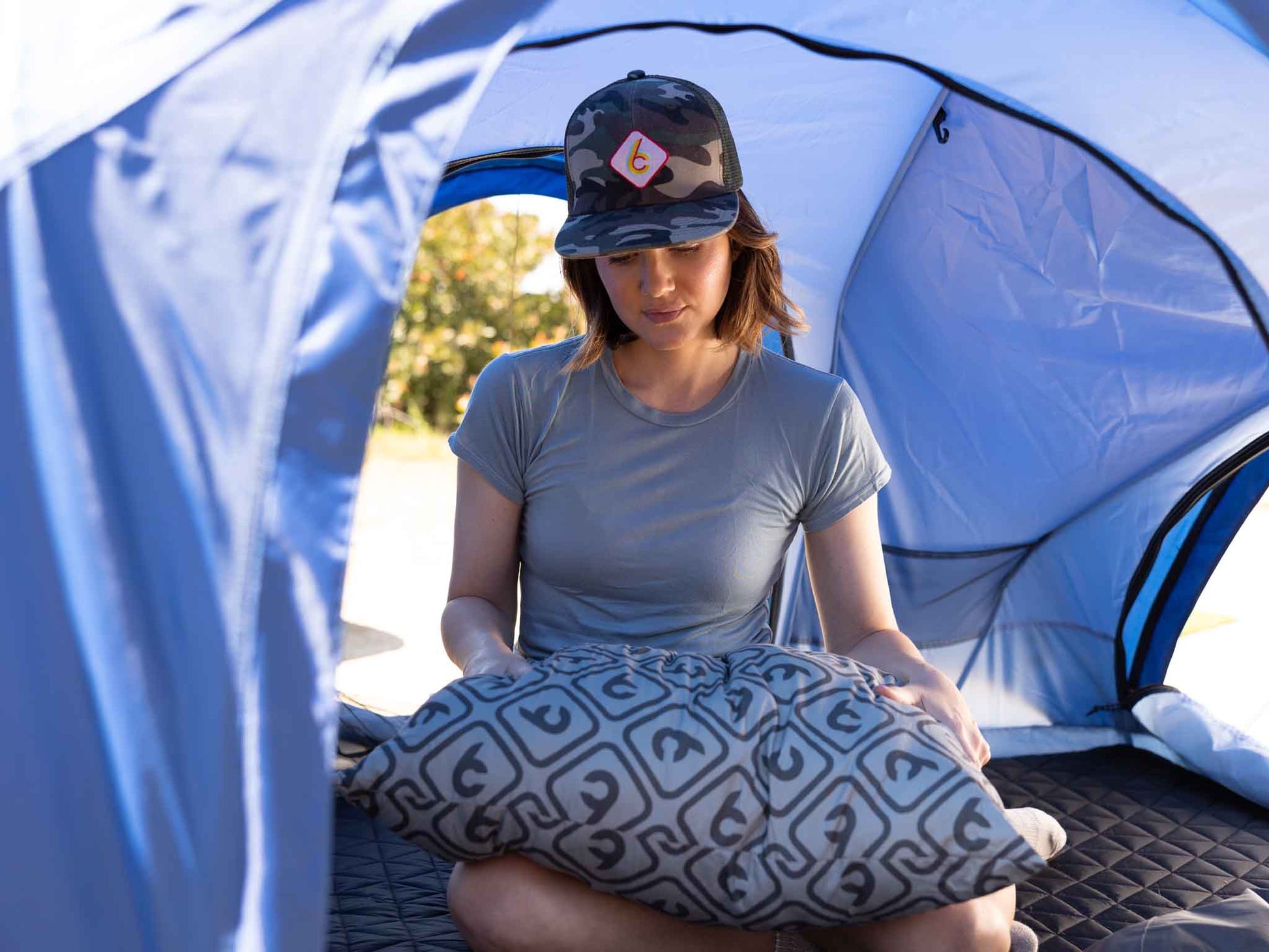 We did an office survey. The C6 team has camped with our heads resting on these various items: tiny blow-up pillows, rolled-up jackets, our arms, dollhouse-sized foam camp pillows, queen bed-sized home pillows, small duffel bags, gathered leaves in a garbage bag, and a dog. The common theme – none of them were satisfactory. Either too hard, too loud, too small, too large… or in the case of the dog, too wiggly.