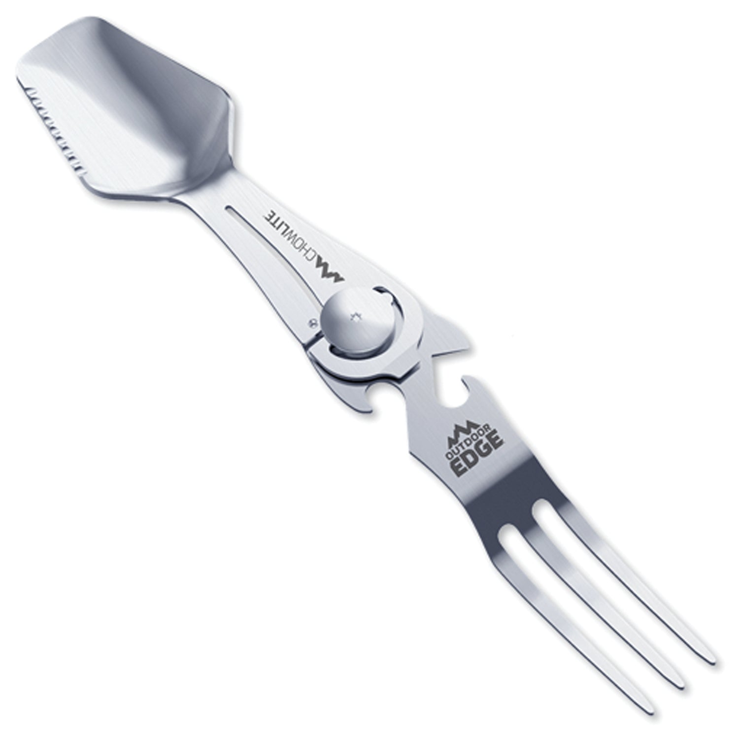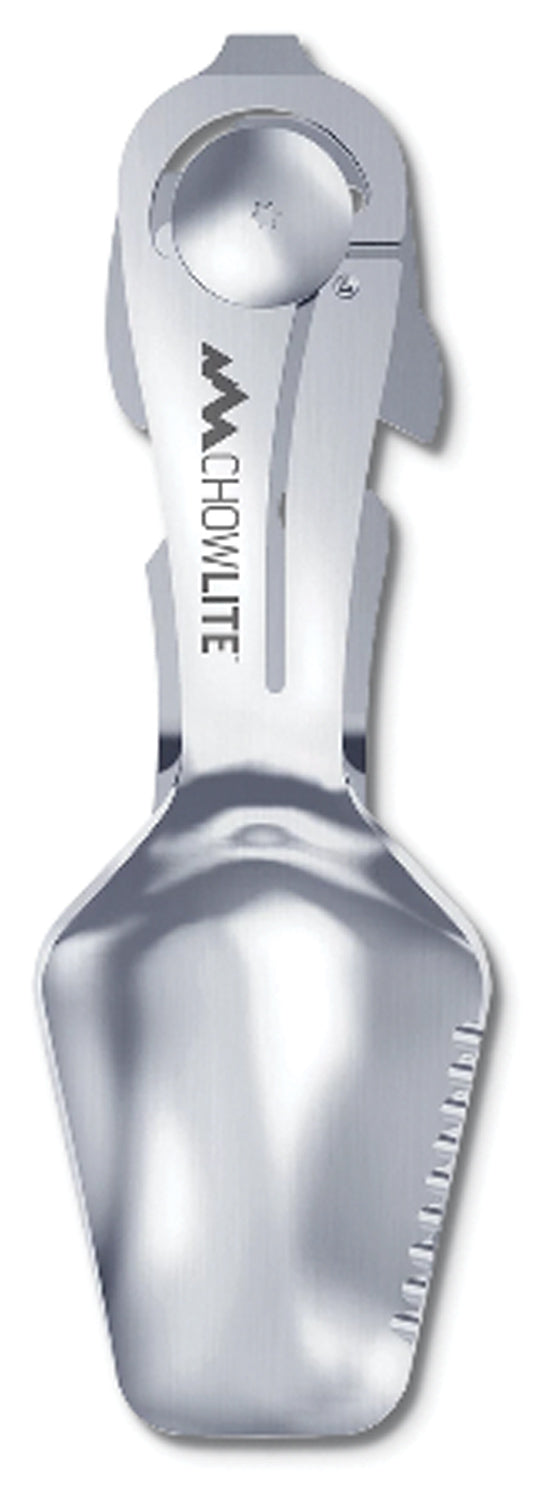 This lightweight stainless steel eating utensil gets the job done while taking up minimal space. The folding design swings open and locks securely, revealing a full size fork and spoon with a serrated food separator, integrated bottle opener, can opener and flathead screwdriver.