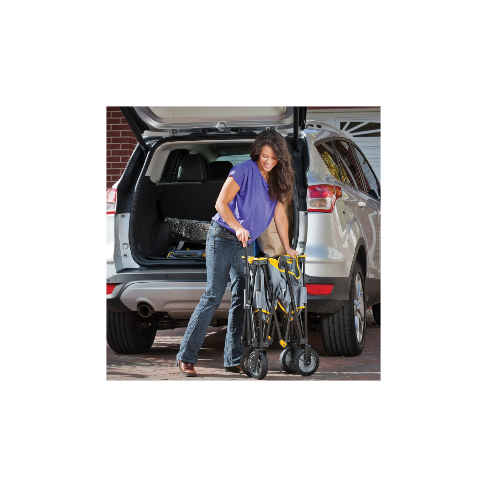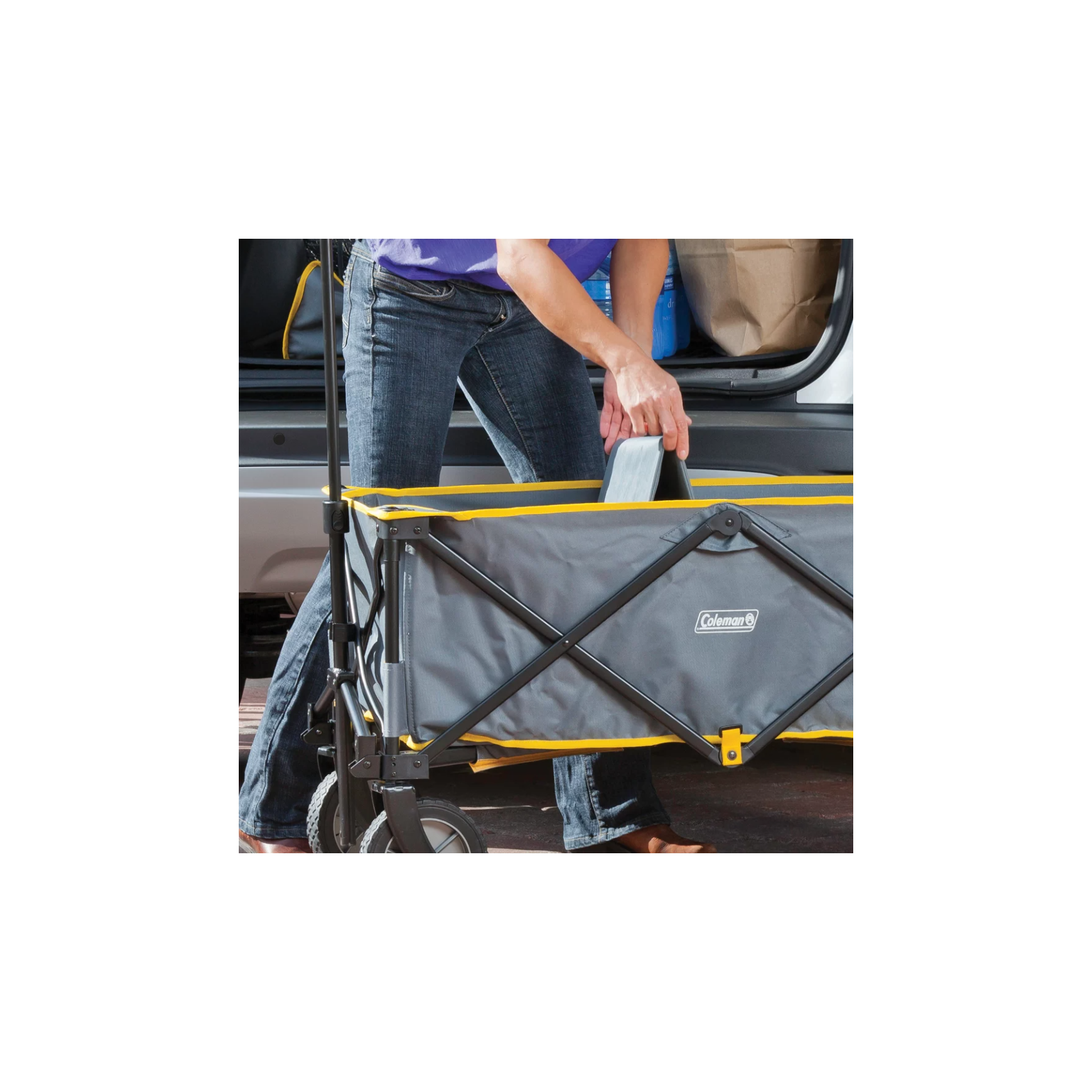 Lugging your gear to the campsite is even easier with the Coleman® Camp Wagon. This durable, rugged wagon has 5 cu. ft. of carrying space, perfect for transporting sleeping bags, coolers, sports equipment, and even your tent. Tough, heavy-duty polyester fabric, a removable, reinforced bottom, and a steel frame provide reliable hauling season after season. The handle connects directly to the axle, giving you superior control. After everything is unpacked, the wagon folds up accordion-style and fits into the included carry case.