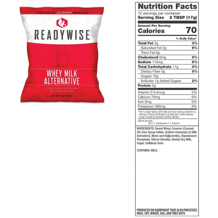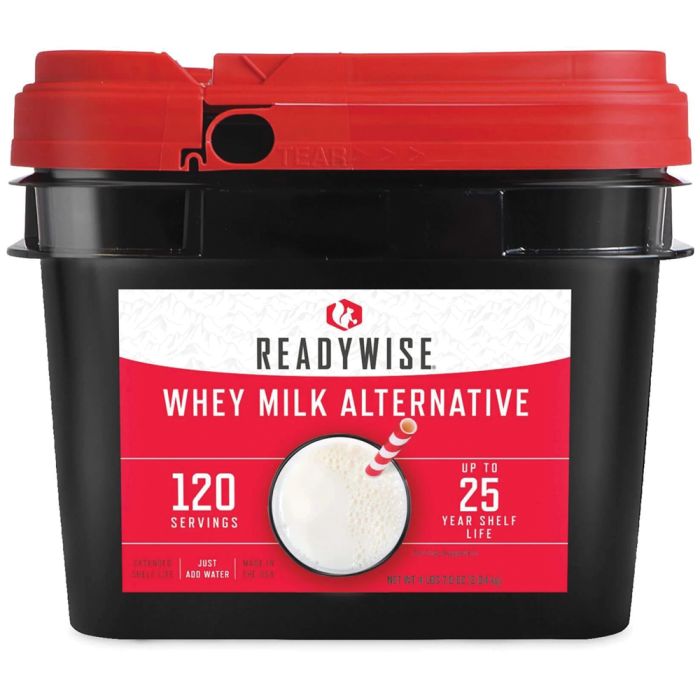 Each bucket contains 120 servings of long-term powdered whey milk. Each individual bucket contains durable mylar pouches of powdered whey milk that can be re-hydrated in a matter of minutes by simply adding water. This product promises to be a nutritious and delicious addition to your ReadyWise entrees and breakfasts.