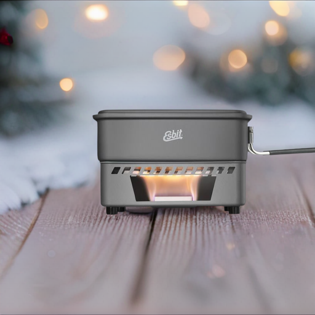 With the introduction of Esbit's largest, 27g fuel tabs, the new 1100ml Solid Fuel Stove and Cookset was only logical. Weighing in at just 180g (pot, stove and fuel), this featherweight stove system is ultra-compact too. The graduated pot easily fits the stove, with plenty of room for utensils, extra fuel and more. For two people traveling or backpacking light with boil-only needs, this lightweight solid fuel cookset is hard to beat.