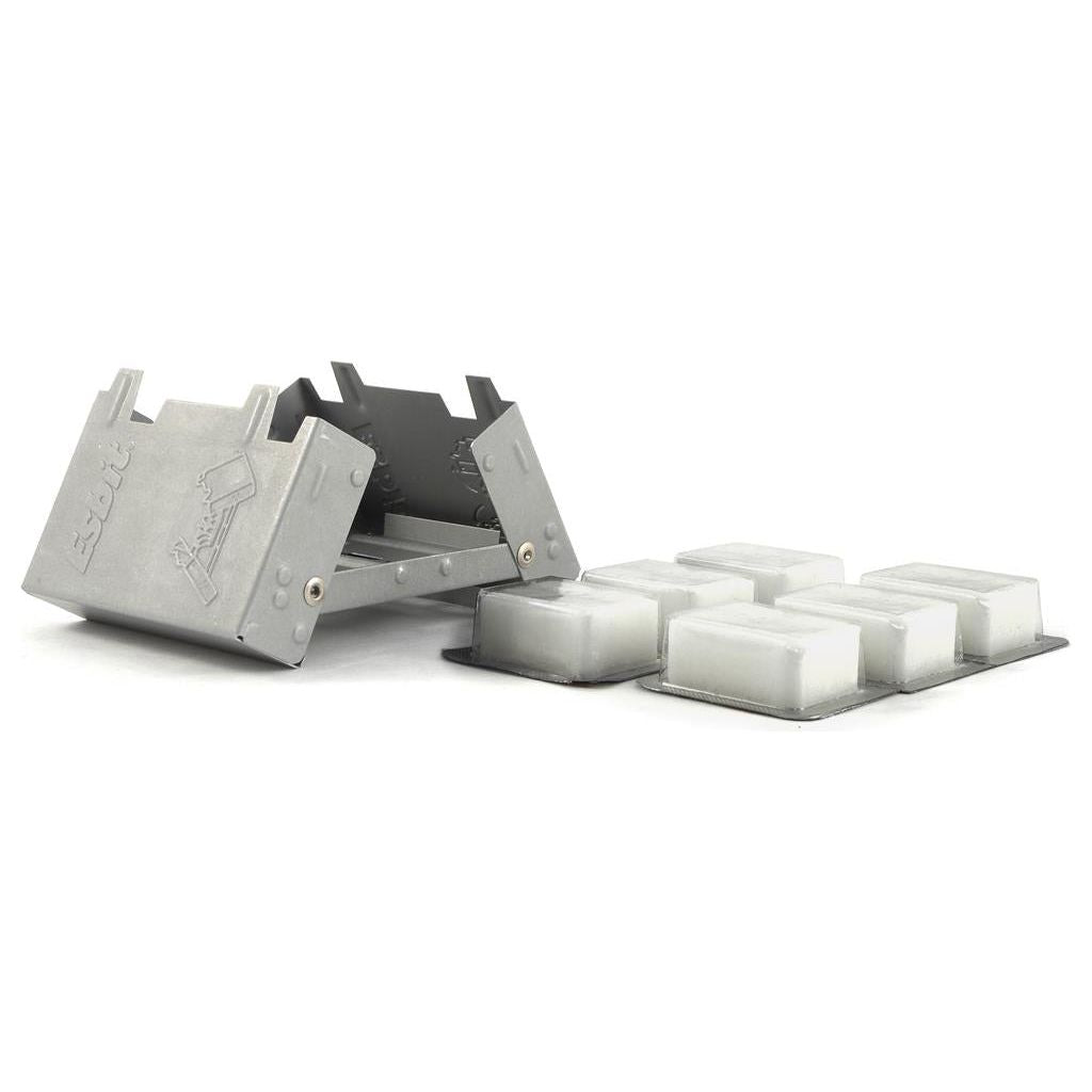 Includes 6 Esbit 14 g solid fuel tablets (small) or 12 Esbit 14 g solid fuel tablets (large). Extra solid fuel tablets store inside stove.