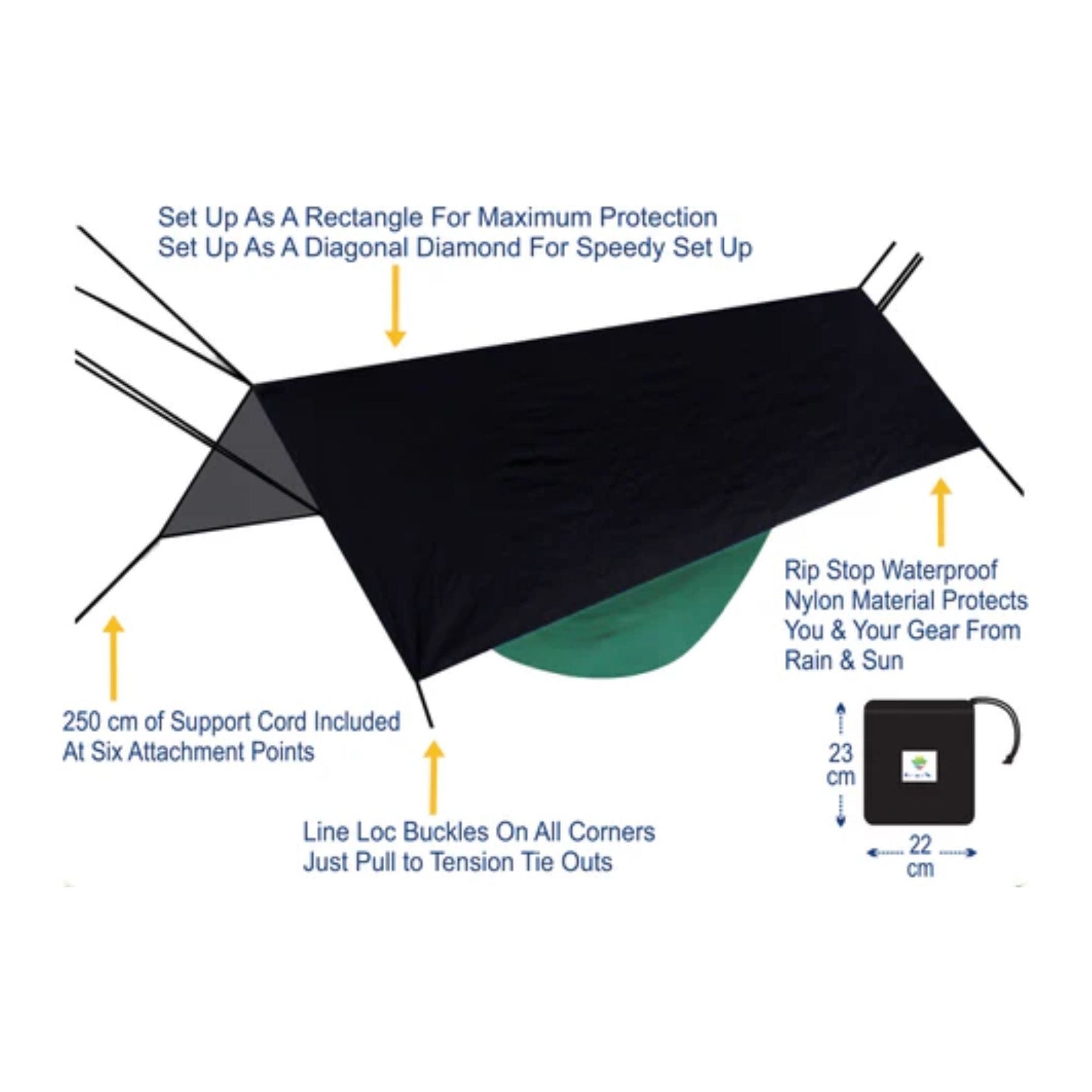 The XL Rain Fly is your extra large and extra lightweight hammock shelter. Its made with a rip stop nylon material that is both waterproof, tear resistant and lightweight. For maximum protection from the rain set up the XL Rain Fly as a rectangle using all 6 cords. For speed and ease set up as a diagonal diamond using only the 4 corner cords. Set up your XL Rain Fly whenever you go into the wild and always stay high and dry.