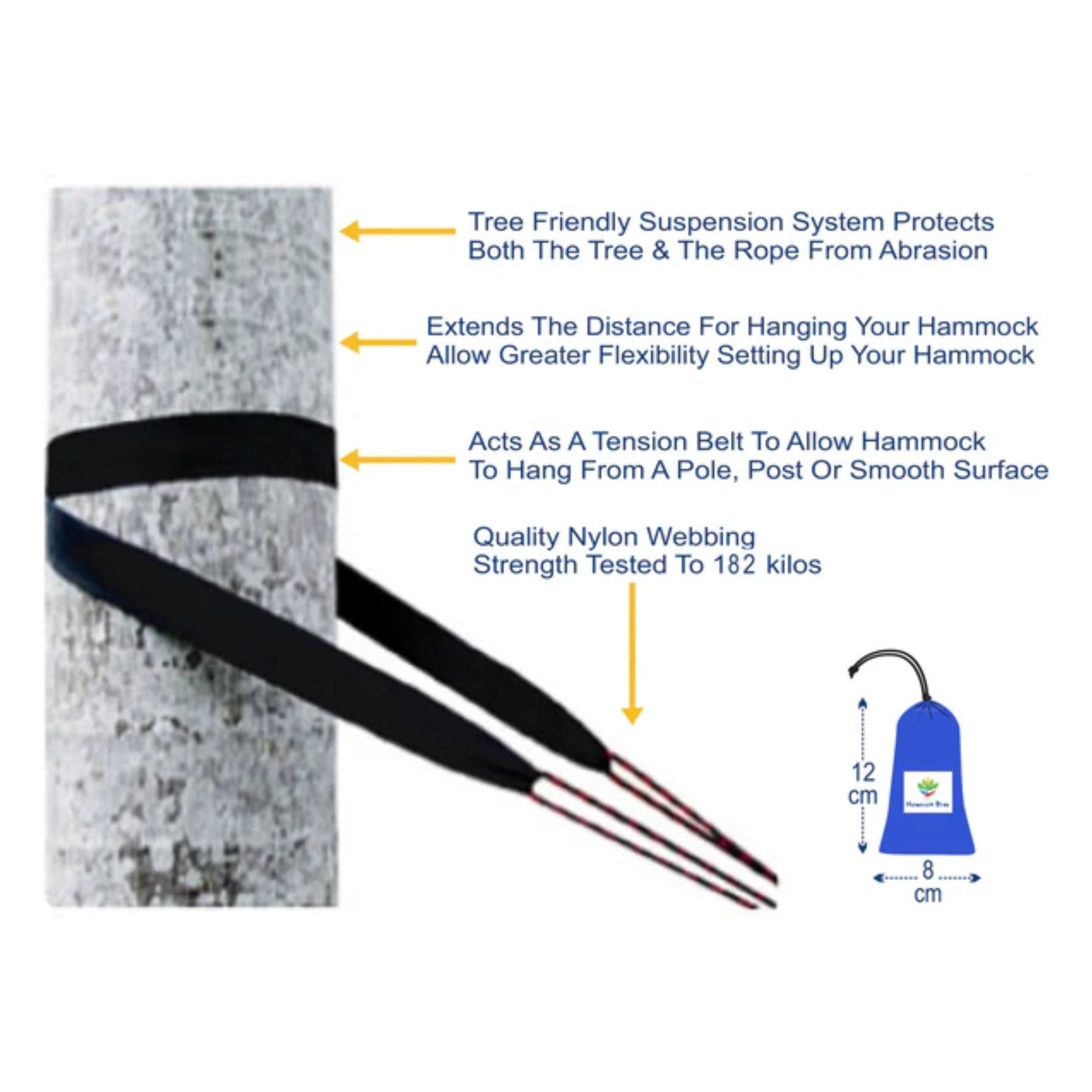 Extra Long Tree Straps make it even easier to set up Hammock Bliss anywhere. XL Tree Straps are an extra long tree friendly suspension system, which extends the reach of the 6mm climbing rope already included on each side of all Hammock Bliss hammocks. XL Straps protect the tender bark of trees by evenly distributing the weight over a wider area while also protecting both the rope and the tree from abrasion. When hanging your hammock from a smooth surface such as a pole or post, tree straps act as a tension belt to prevent slippage. XL Tree Straps are completely adjustable and are ideal for quick set up and fast take down of your hammock.