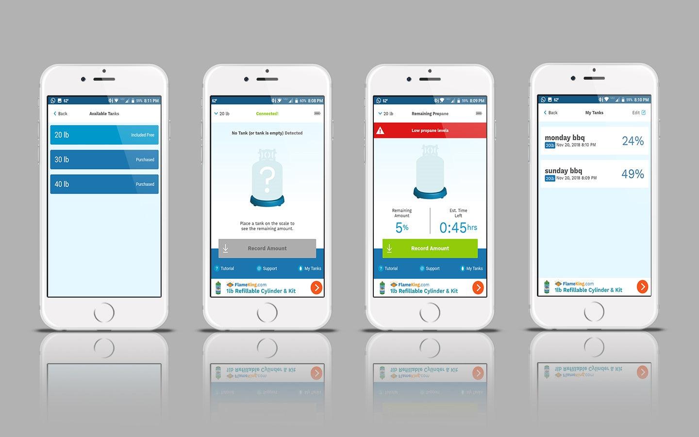 The free Flame King app connects via Bluetooth, allowing you to monitor propane weight and usage directly from your phone or tablet. Compatible with iOS and Android devices.