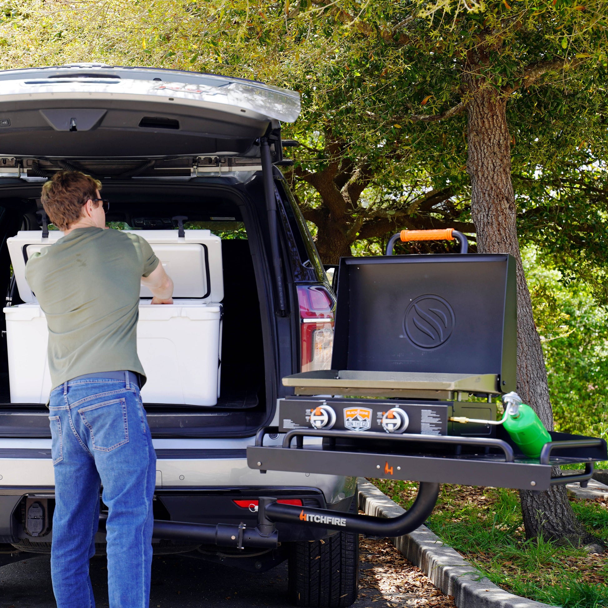 No need to unload your Ledge to access the back of your vehicle. The proprietary HitchFire swing arm allows for easy access to the trunk or tailgate. Cook on a stovetop, setup your laptop, or fire up a smoker, the large flat surface of the Ledge offers limitless possibilities.