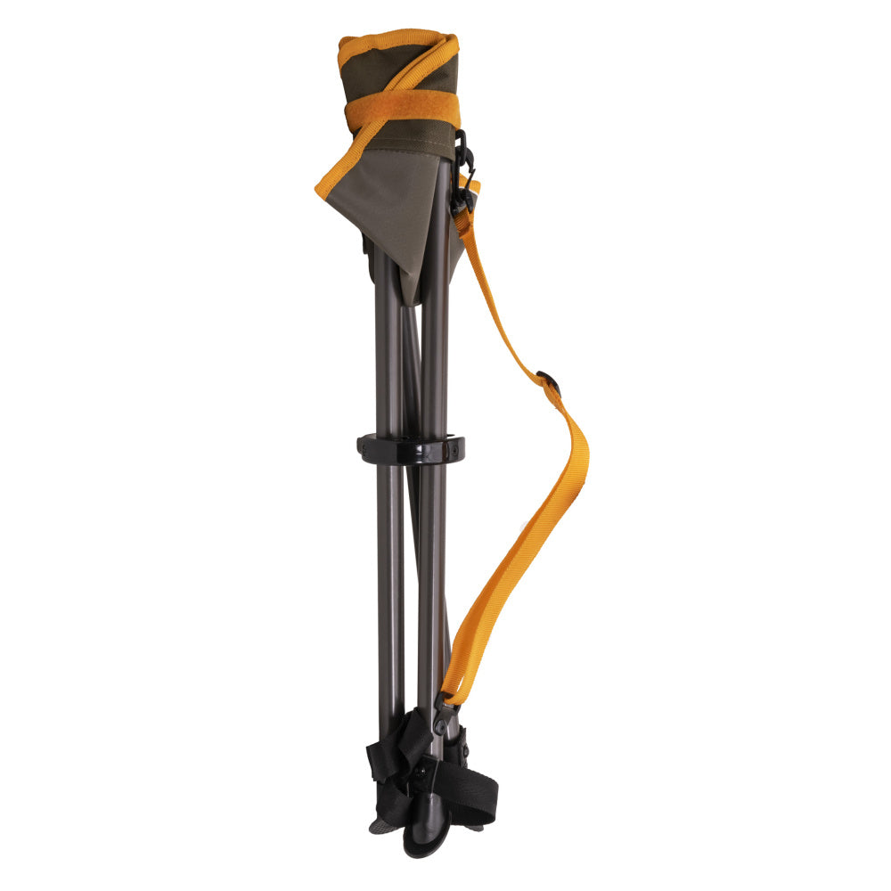 The Tri-Leg is perfect for bringing along when space is limited, and weight is a factor. The Tri-Leg folds up and fits compactly into a carry bag. The 2-pound stool is made of a powder-coated steel frame and has a reinforcing extra center support system to hold up to 250 pounds. The fabric is made of durable 600D Polyester. There is also a carry strap attached to the Tri-Leg in case you don't want to bring the carry bag along.